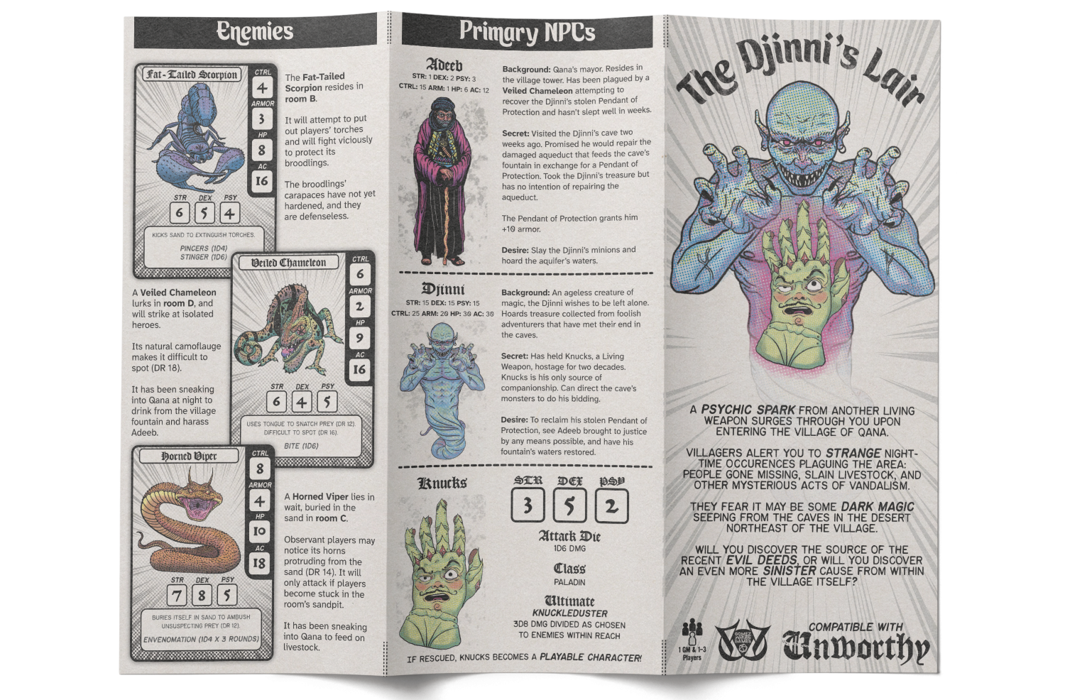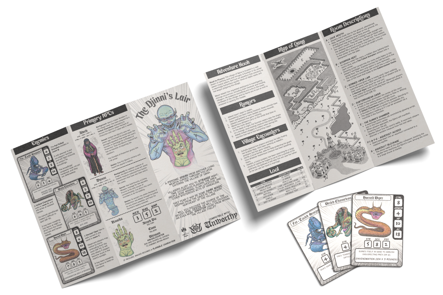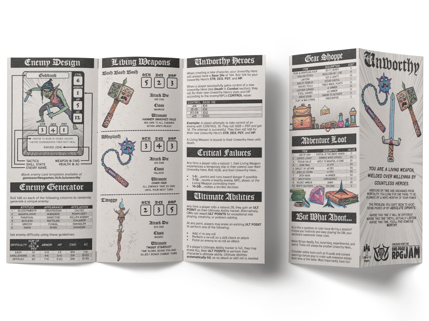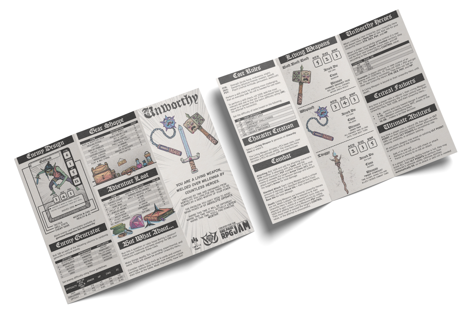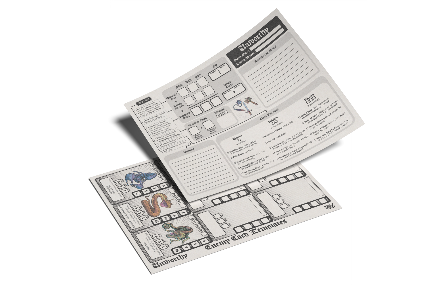 Dropped into a world of magic, monsters, deadly traps, and nefarious denizens, none of us would last the night. Unworthy gives you and your players a chance to experience the perils of adventure without the pain of introducing a new character every time the dice conspire against you.